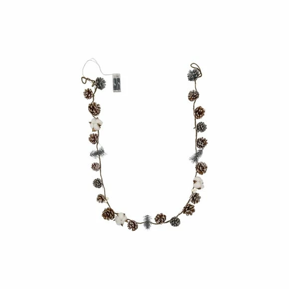 Decorate your mantel piece, table or side boards with the decorative and illuminating looks of this festive garland. Featuring faux cones, snowy pines and 20 LED lights entwined on a jute type string, this decorative piece will create a warm glow and bring the garland to life.