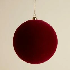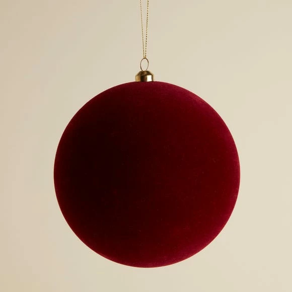 Modern and stylish, this festive Merlot red bauble features a soft touch flocked finish, in an oversized round shape. It come with a large loop so you can easily hang it to your tree.
