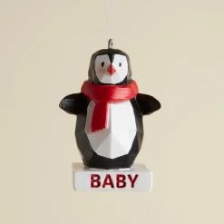 This cute, festive ornament is easy to hang on your Christmas tree. It is a resin figure of a baby penguin, with a red scarf.