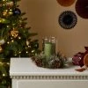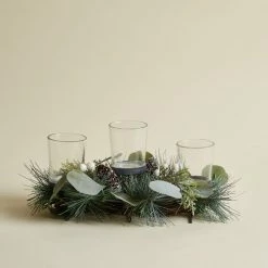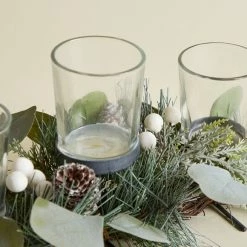 This boho 3 glass tealight holder is a beautiful accent for any living space. Featuring faux eucalyptus leaves wrapped around twigs and highlighted with pinecones and white artificial berries. This tealight holder will be a welcome addition to any home this festive season.