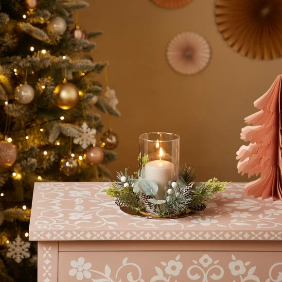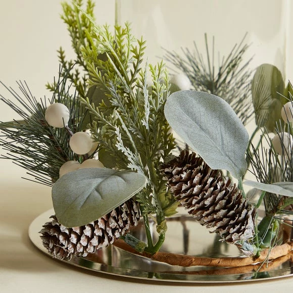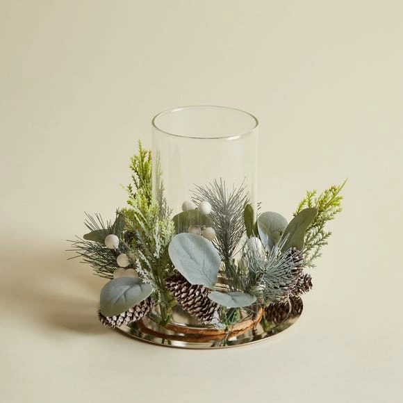 This boho glass pillar holder is a beautiful accent for any living space. Featuring faux eucalyptus leaves wrapped around twigs and highlighted with pinecones and white artificial berries. This holder will be a welcome addition to any home this festive season.