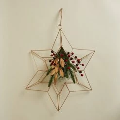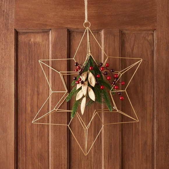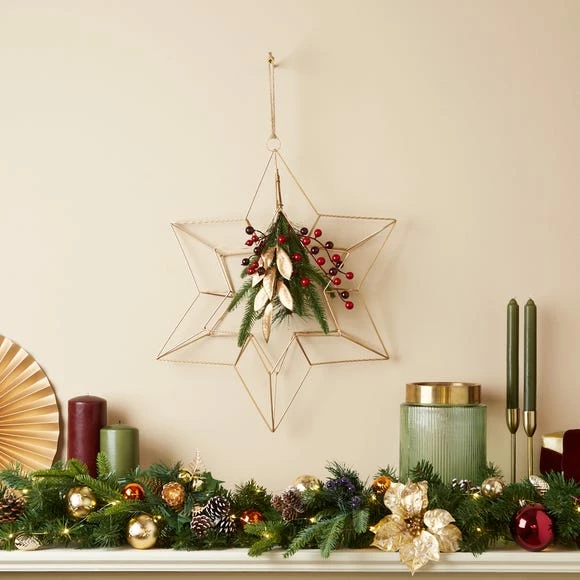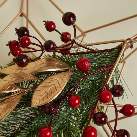 This star wreath is designed in a stylish geometric pattern made from gold metal. Finished with festive red berries, pine needles and leaves for that extra Christmassy touch.