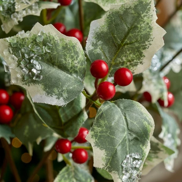 Perfect for displaying in a vase, this realistic designed iced holly spray features eye catching red berries and doesn’t need any maintenance.