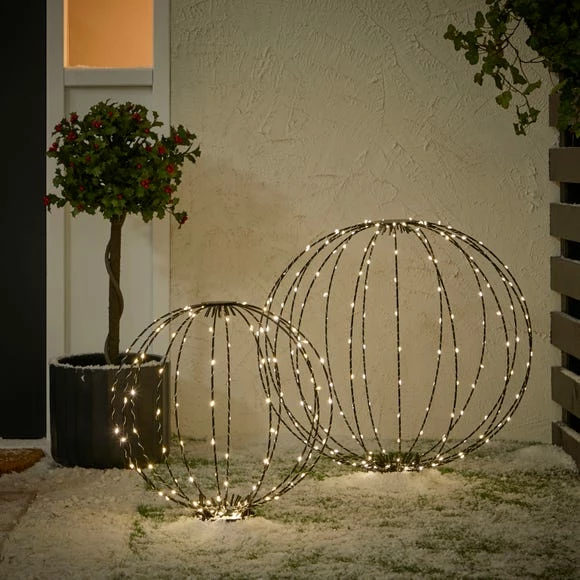 Add a festive touch to your outdoor space with this 35cm Oversized Metal Fold Out Bauble. Featuring 96 LED lights that will shine a subtle warm white glow in your home or outdoor space. The versatile design allows you to hang it on a tree or place on the ground.