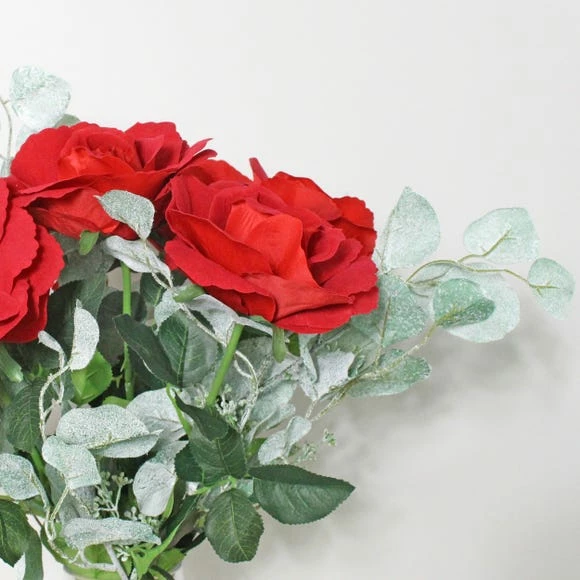 Decorate your home with our beautiful bouquet featuring traditional red roses with snow effect Eucalyptus. The bouquet has been hand-tied for that personal touch, perfect for your Christmas display. This bouquet is ideal for displaying in a vase or can also be a perfect gift for a loved one!