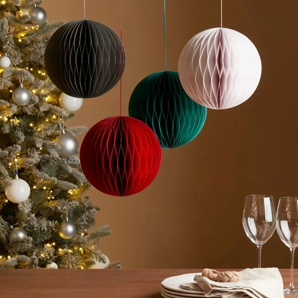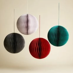 This elegant set of hanging decoration features a stunning range of festive colours. Crafted with a honeycomb design and made from 100% paper, these decorations can be easily hung with the string provided.