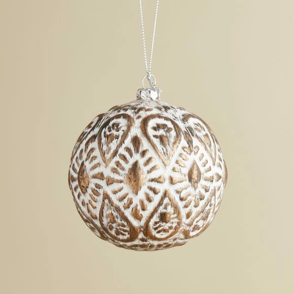 Simple yet elegant, this stunning round bauble features intricately crafted gold raised patterns with a matt finish. Designed with a large loop so you can easily hang it to your tree.