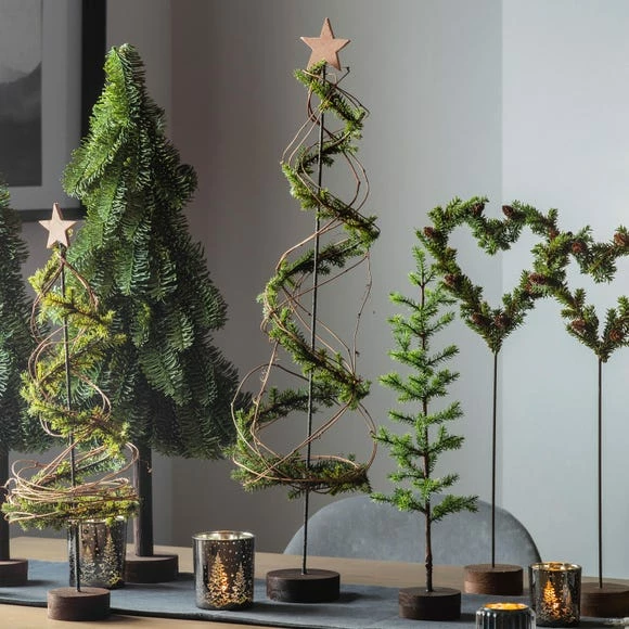 Bring the festive cheer to any interior, no matter how big or small the space, with this charming table size Christmas tree. This quirky piece has a spiral design body, is topped with a wooden star and sits on a log base. Great for sitting on a table along with a Christmas spread or side table to add subtle festive notes across your interior, this decorative tree is also available in a smaller size to coordinate with and spread across the house.