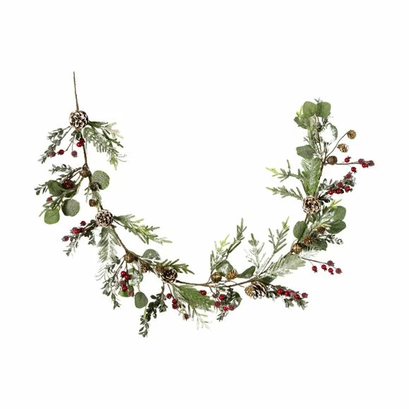 Dress your mantle piece or table with the ultimate festive garland to decorate your space. Featuring a leafy pine base, classic winter berries and frosted pine cones, this garland is even designed with jingle bells for a complete Christmas feel.