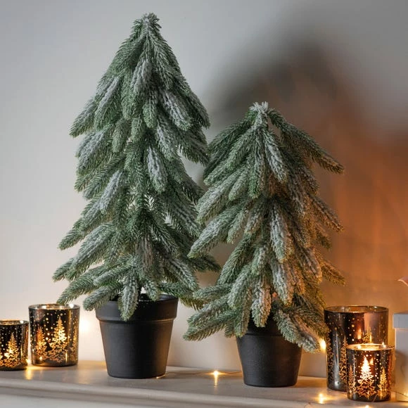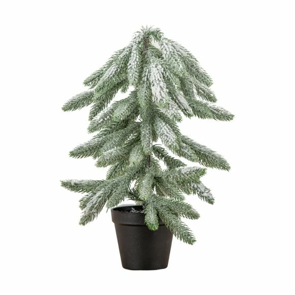 Fill your home with the magic of Christmas with this lovely faux snowy spruce tree. Potted in a simple black pot and finished with a frosted topping on the pines, this pine tree can modestly sit on your tabletop, fireplace or any other space in your home, for a simple but ornamental addition. Also available in a larger size, great for grouping together.