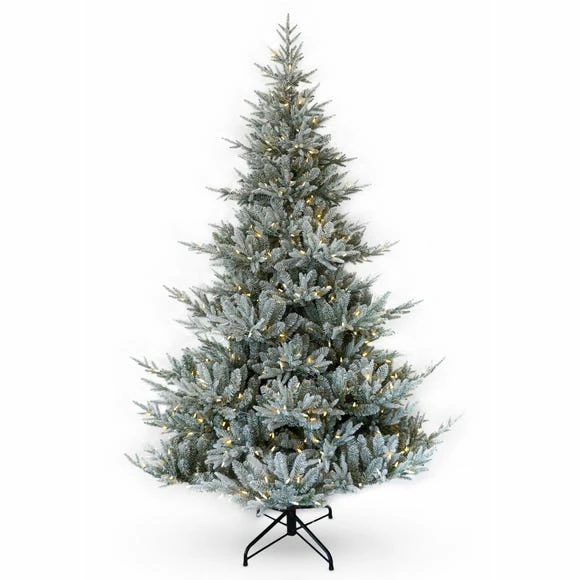 Add a touch of charm to your holiday décor with this 7ft Feel Real Nordmann Spruce Christmas tree. This prelit tree features snow-covered branches and comes with 450 warm white LED lights and 2901 tips. The sturdy folding metal tree stand is included. With its hinged branch construction, this traditional tree adds ease to assembly while maintaining a realistic look.