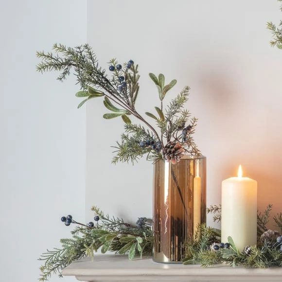 Impress your guests with a remarkable floral display featuring pale green pines, sloe berries in a deep frosty blue colour and leaves. This set of spray will add some homely rustic charm to your space and require no maintenance so will stay fresh throughout the entire season.