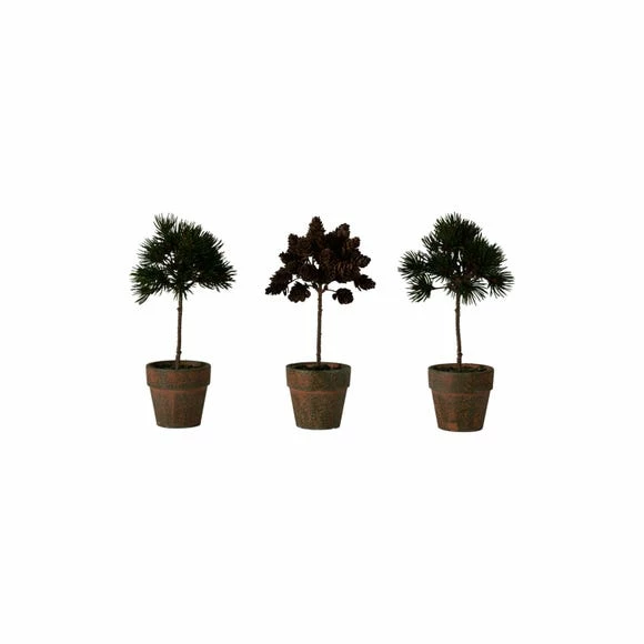 Bring this set of potted plants to your home décor for a rustic touch with natural appeal and incredible details. Featuring two faux green pine trees and one faux brown cone tree, you can create a delightful, coordinated group collection or they can look equally as beautiful displayed individually. Displayed in a simple weathered effect rustic pot, these faux trees will add a homely touch and require no maintenance so will stay fresh all year around.
